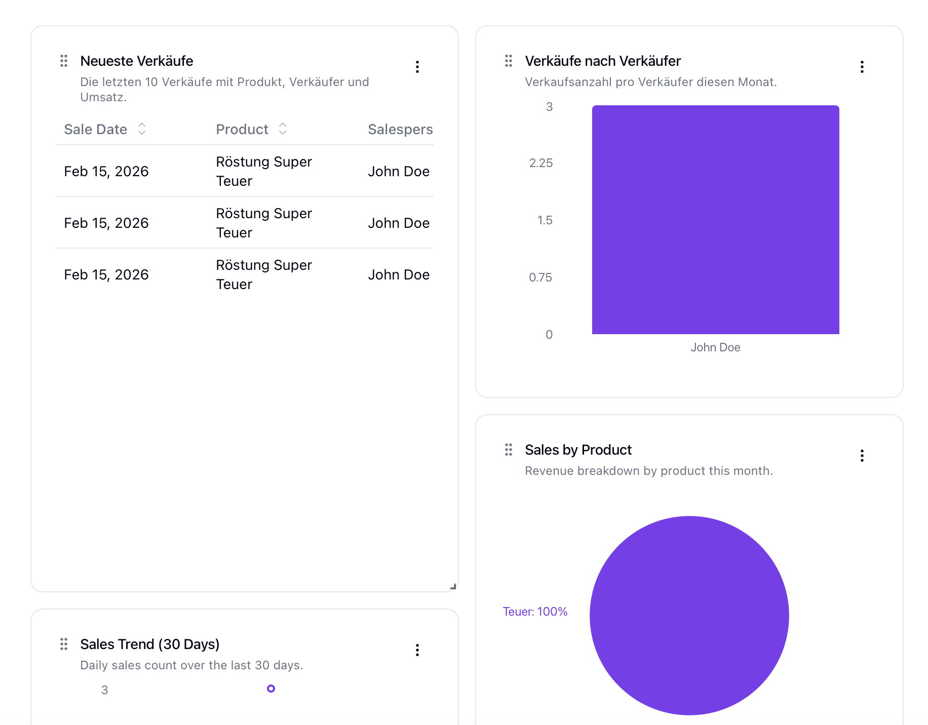 Every team member now has a profile page with their personal KPIs: sales count, commission earned, targets hit, and activity over time. Managers can review individual performance without building a custom dashboard for each rep.