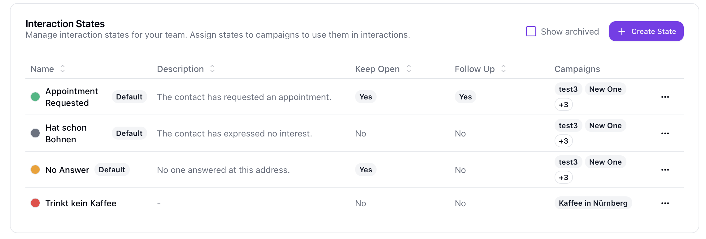 Interaction states — the stages a lead moves through in your sales process (e.g., No Answer, Interested, Appointment Requested) — are now managed at the team level and assigned to campaigns. States can be configured with colors, follow-up requirements, and campaign assignments, giving every manager a consistent view across all territories.