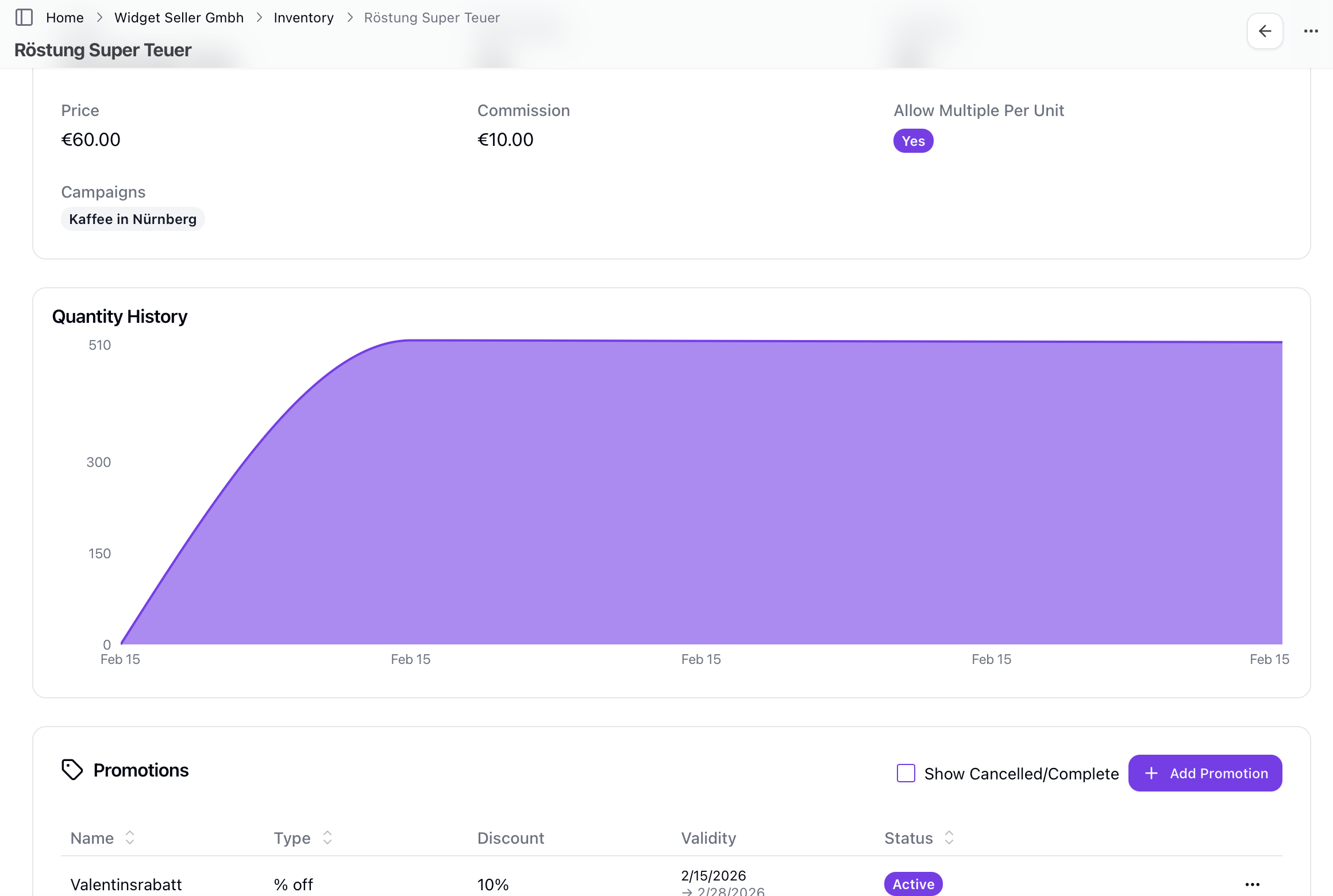 Products are now managed in a central inventory. Each product has a name, description, price, per-unit commission amount, and optional quantity tracking. Products can be assigned to specific campaigns to control availability, and stock movements (shipments in and out) are logged for full traceability. On top of that, you can run promotions on any product — set a date range and a promotional price or commission override, and the system applies it automatically during that period. Promotions are tracked on every affected sale and commission entry so the numbers always add up correctly.