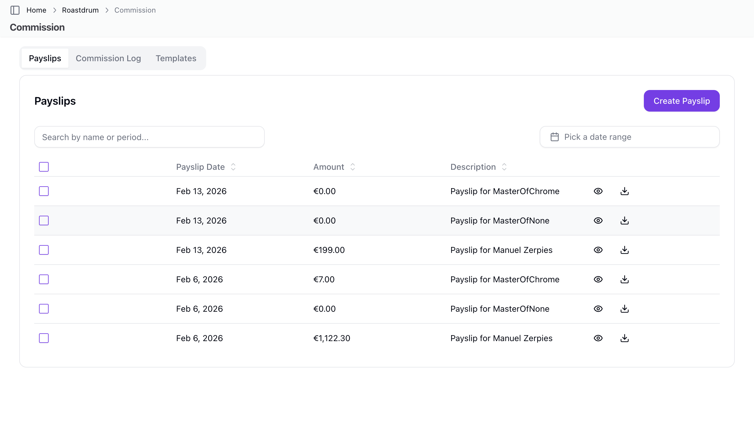 This guide shows you how to view commission data and manage payslips for tracking your earnings.