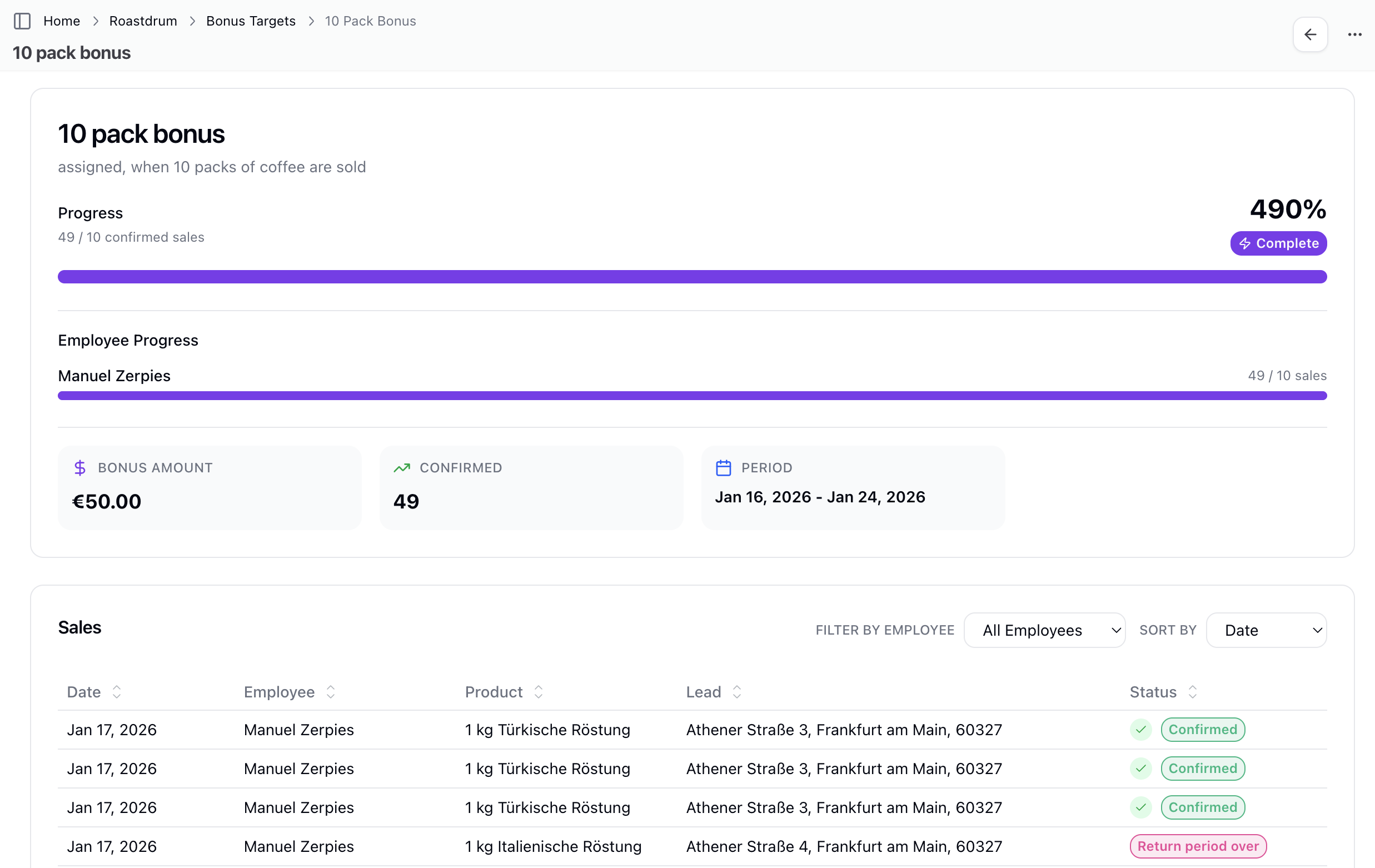 Define and track team goals with bonus targets. Bonus targets help motivate the team by setting clear objectives with associated bonus amounts.