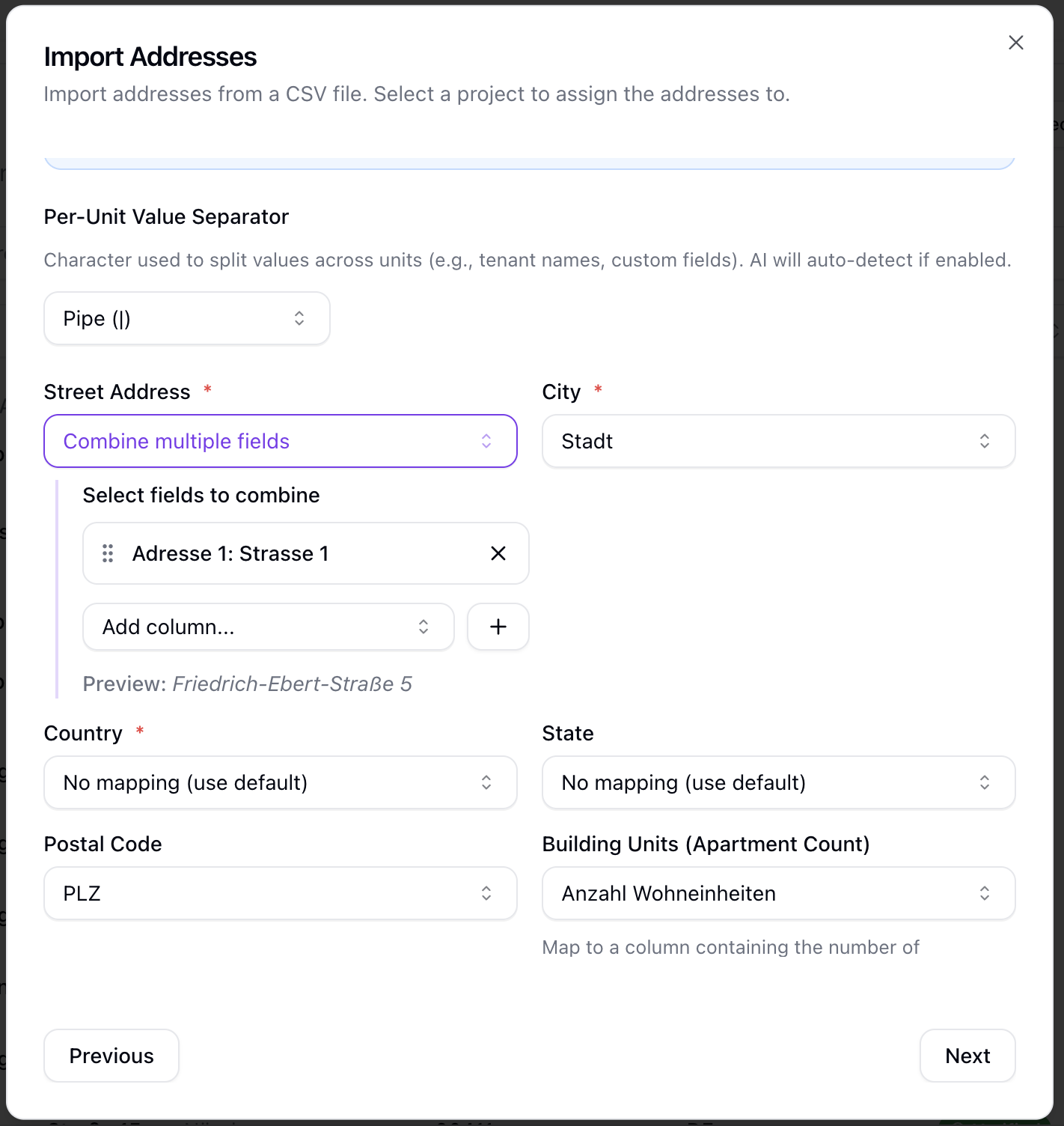 When enabled, the system analyzes your CSV column headers and suggests mappings automatically. This is especially useful when your CSV uses non-standard or localized column names. You can review and adjust the suggestions before proceeding.