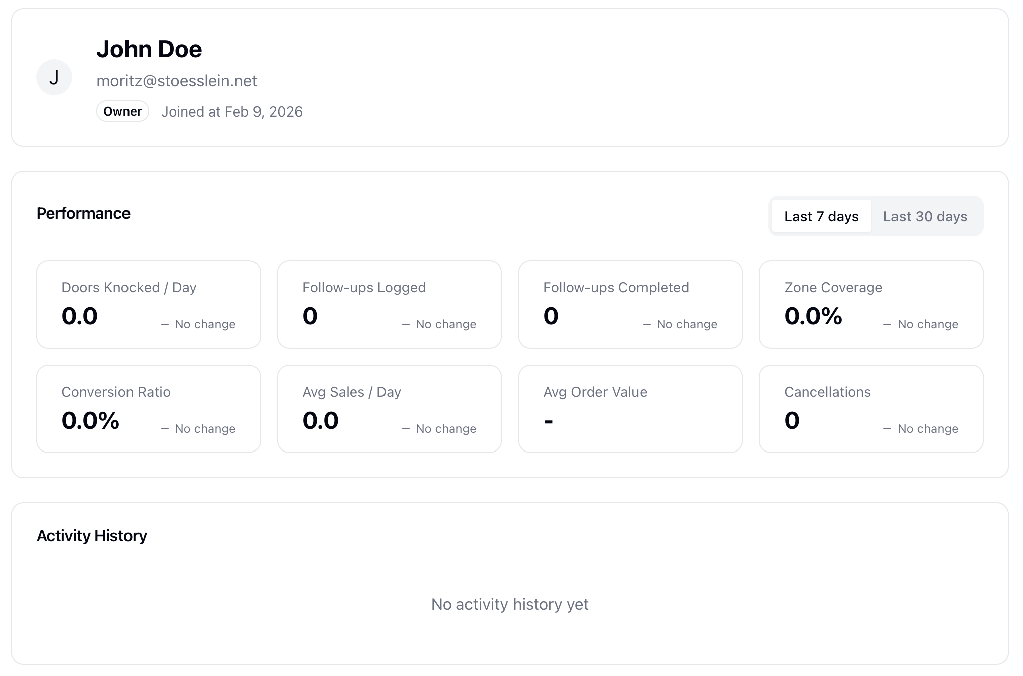 It contains performance KPIs as well as the latest interactions and sales of the team member.