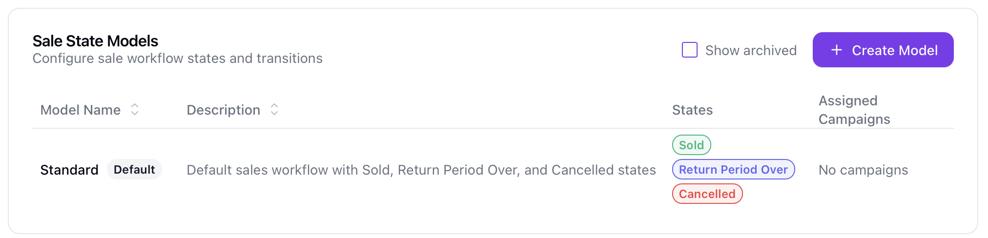 Note: Each campaign can only have one sale model assigned. Assigning a new model replaces the existing assignment.